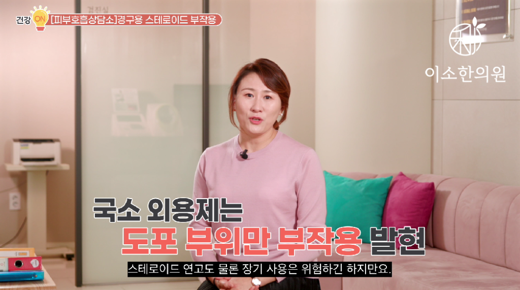 “외용제는 바른 부위 주변으로만 좀 부작용이 국한적으로 생긴다면. 예를 들어서 얼굴에 사용 했다면 스테로이드 중독증이 생기더라도 목 위에서만 끝난 다던가 하는 식으로요. 그런데 이렇게 먹는 약은 전신에 흡수가 되기 때문에 피부에도 전신적으로 부작용이 나타납니다.”