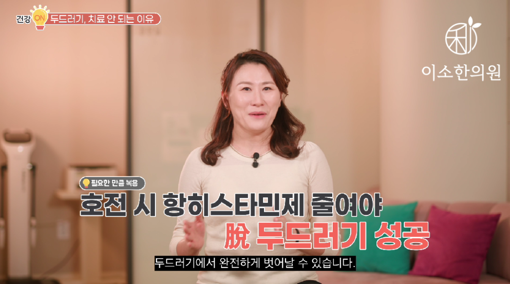 때문에 가장 우선적으로 필요한 것은요 잘 쉬고 건강하게 규칙적으로 먹고, 스트레스 받지 말고 적정한 운동도 하셔서 건강한 몸을 만드는 것입니다. 그리고 만약 잘 개선이 이렇게 해도 되지 않는다면요. 히스타민 작용을 차단하는 항히스타민제나 스테로이드 등으로는 잘 해결이 되지 않습니다. 반드시 치료의 목표는 이렇게 비정상화된 면역체계를 바로 잡는 것이 있어야 합니다.