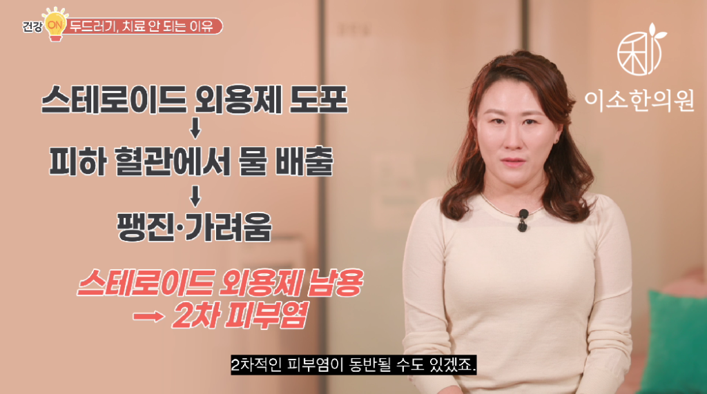두드러기 초반에 스테로이드를 먹거나 바르거나 혹은 주사를 맞을 때 두드러기가 재발 반복하면서 만성화될 수 있습니다.