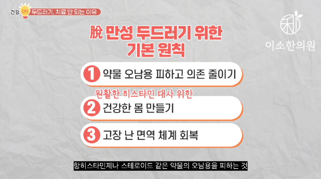 항히스타민제나 스테로이드 같은 약물의 오남용을 피하는 것, 그리고 지나친 의존을 줄이는 것, 그리고 히스타민 대사를 잘 할 수 있는 건강한 몸을 만드는 것, 그다음 마지막으로요. 고장 난 면역체계를 회복하는 것이 만성 두드러기에서 벗어나는 기본 원칙입니다.