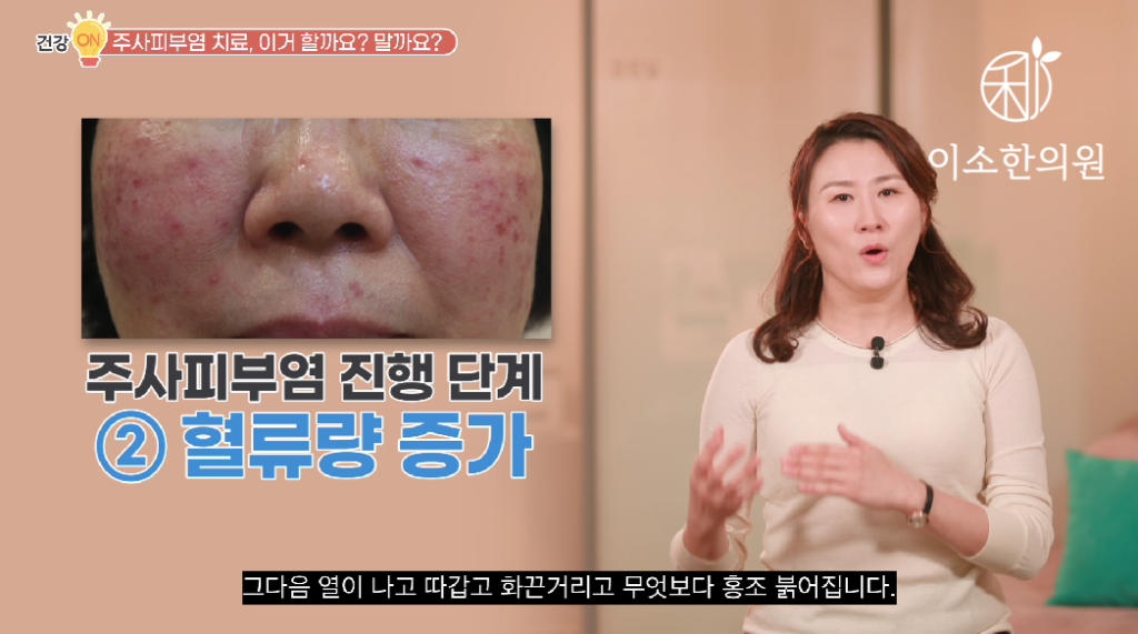 주사피부염의 반복되는 염증은요. 피부 면역체계의 이상이라든지, 자율신경계의 이상이라든지, 체온 조절 기능의 이상이라든지, 혹은 심리적인 불안정 이런 등등의 복합적인 요인에서 기인합니다. 그래서 몸이 건강해지고 정상적으로 체온을 조절할 수 있게 되고 그래야만 상열감이 해소되고 그다음 피부가 튼튼해지면 가장 기본적인 염증이 해결 되겠죠. 이건 한의원에서 치료해야 하는 영역이죠.