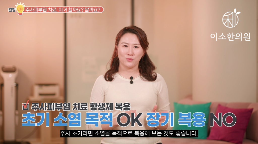 주사피부염에 항생제 복용 할까요? 말까요? 주사 초기라면 소염을 목적으로 복용해보는 것도 좋습니다. 그런데 복약 목적에 맞지 않기 때문에 장기간 복용할 약물은 아니다. 라고 결론지으면 되겠습니다.