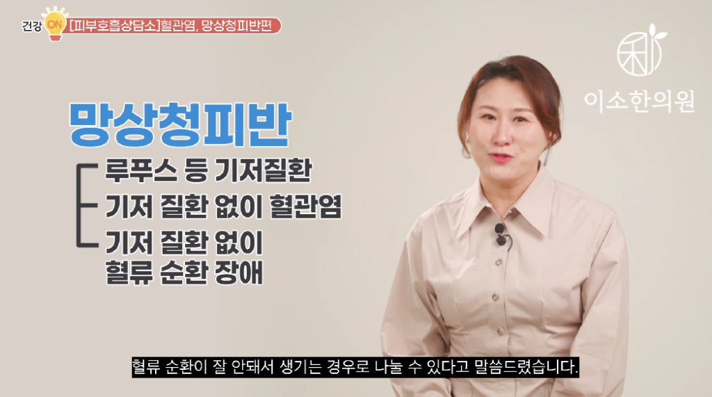 망상청피반은요. 루푸스 같은 기저 질환이 있는 경우와 기저질환 없이 혈관염으로 인한 경우, 혹은 특별한 기저 질환은 없지만 혈류 순환이 잘 안돼서 생기는 경우로 나눌 수 있다고 말씀드렸습니다.