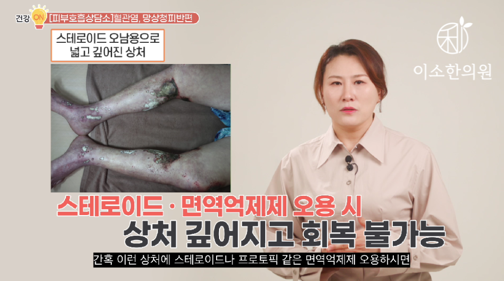 두 번째 경우에서 혈관염이 동반된 경우에는 망상청피반은 치료하지 않으면 상처 생길 수 있다고 말씀 드렸죠.