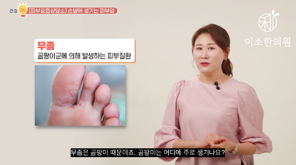 우선은요. 구체적인 질문을 들어가 보기 전에 손발에 생기는 대표적인 질환들 한번 짚어보겠습니다. 첫 번째는요. 무좀입니다. 무좀은 곰팡이 때문이죠. 곰팡이는 어디에 주로 생기나요? 음지, 습하고 햇빛이 안 드는 곳에 생기죠. 때문에 손발 중에서도 발에 많이 생기고요. 발가락 사이 피부에 겹쳐지는 부위, 혹은 땀이 나고 신발에 가려지는 부위에 호발 합니다.