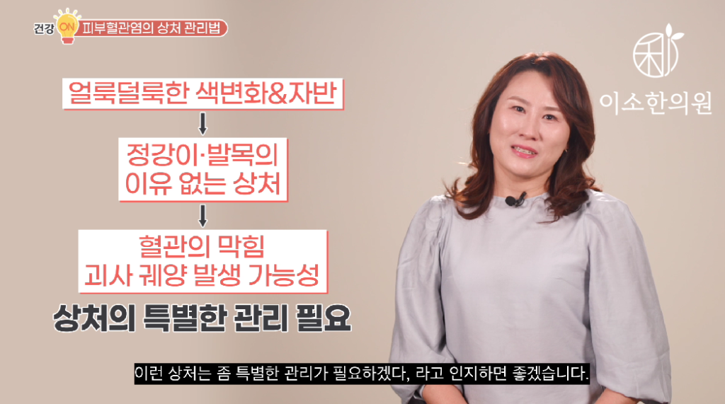 우선은요. 상처 안 만들어져야겠죠. 상처가 만들어지지 않도록 해야 됩니다. 만약에 혈관염, 망상청피반이 의심된다면 무엇보다 좀 빨리 찾아 오셔서 제대로 치료 받으시고 상처 안 만들어야 하겠습니다. 그리고요. 상처가 주로 생기는 부위는 발목, 발등, 정강이 피부 얇은 곳 마찰이 잦은 곳이므로 양반 다리를 한다든지, 무릎 꿇고 앉는 자세들을 피하시고요. 발목이나 정강이 주변은 평상시에도 약간 쿠션감 있는 양말이나 거즈를 좀 활용해서 마찰, 자극을 피해야 합니다.