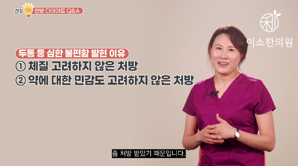 몸이 불편할 정도로 증상이 나타난다는 것은 첫 번째 원인은요. 체질을 고려하지 않는다는 것, 두 번째는 환자마다 약에 대한 민감도에 대한 고려 없이 좀 처방 받았기 때문입니다. 다이어트 한약에 주요 약재 중 하나는 마황이라는 약재인데요. 제가 우스갯소리로 마황일물탕입니다. 이렇게 표현하기도 하는데 살 빼려는 욕심에 마황만 위주로 과도하게 처방된 경우, 조금 저렴한 비용으로 기성화된 다이어트 한약을 처방 받으셨을 때 혹 이런 불편감을 경험하셨을 확률이 높습니다.