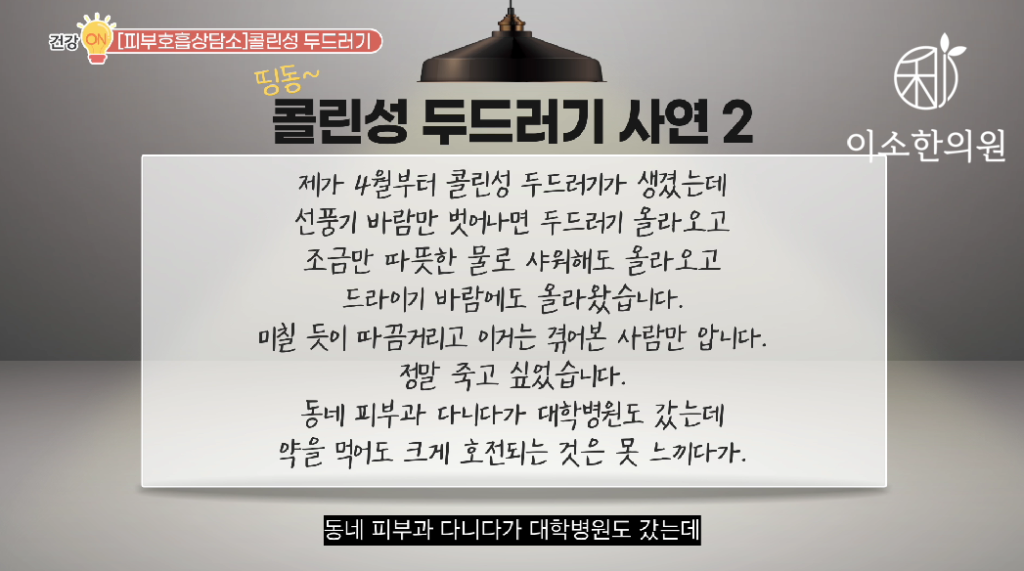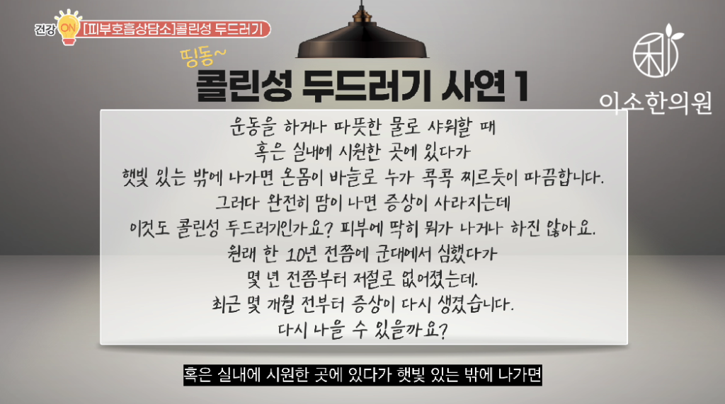 오늘은요 보내주신 사연 바탕으로 콜린성 두드러기에 대한 궁금증 풀어 보는 시간 가져보고요. 그리고 어떤 경우 치료가 잘되고, 어떤 경우 예후가 좋지 않은지 이야기 해보는 시간 가져 보겠습니다.