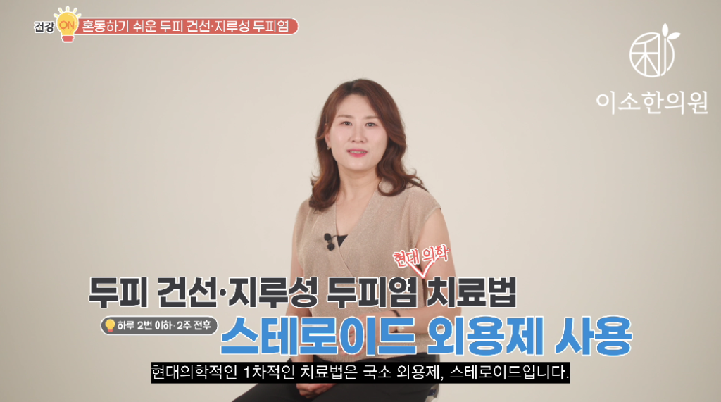두피 건선, 지루성 두피염 두 가지 질환 모두 현대의학적인 1차적인 치료법은 국소 외용제, 스테로이드입니다. 환부에 하루 2번 이하 2주 전후로 스테로이드 성분의 외용제, 샴푸 한번 사용해보고 호전되었다면 사용량 줄이고. 재발 안했다면 항상 말하지만 끝입니다. 괜찮습니다. 저한테 오지 않아도 됩니다. 하지만 만약 외용제 바르고 머리 잘 감고 스트레스 관리, 생활 관리 잘해도 낫지 않는다, 재발 반복한다, 그러면 내원하셔야 겠죠. 두피 건선, 반복되는 지루성 두피염 모두 피부 면역체계의 이상에서 기인하죠. 반복된다면 근본적인 치료 방법으로 접근을 해야겠습니다.