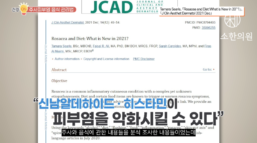 JCAD라는 피부학술지에 주사피부염과 음식에 대해서 조사를 한 내용이 있더라고요. 주사와 음식에 관한 내용들을 분석 조사한 내용들이었는데 결론은 앞서 말씀드린 신남알데하이드나 히스타민이 피부염을 악화시킬 수 있는 성분은 맞다. 그리고 알코올은 52%, 매운 음식은 45% 정도로 주사환자에게 트리거포인트, 비교적 명확한 악화 인자의 가능성이 있다고 했습니다. 근데 이제 과일은 13%, 양념된 육식은 10%, 채소는 9% 정도 연관이 있다고 기술이 되어 있는데.