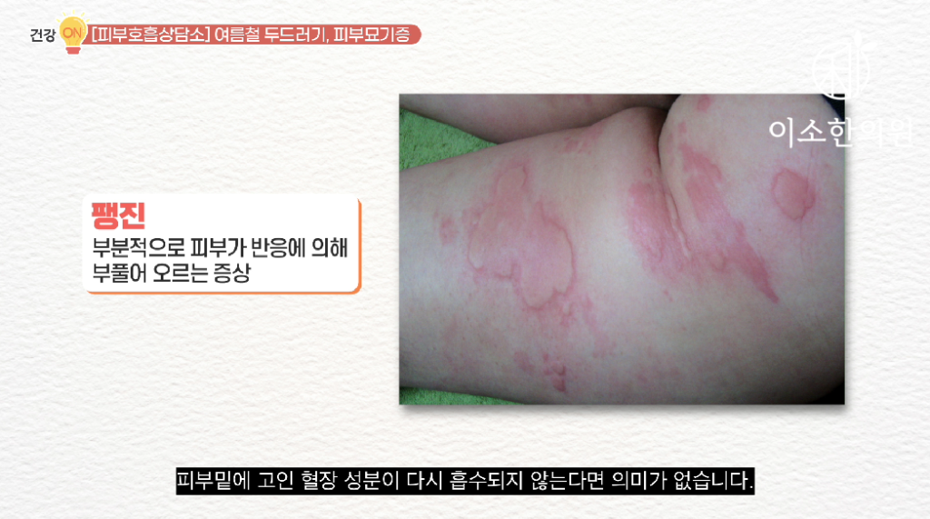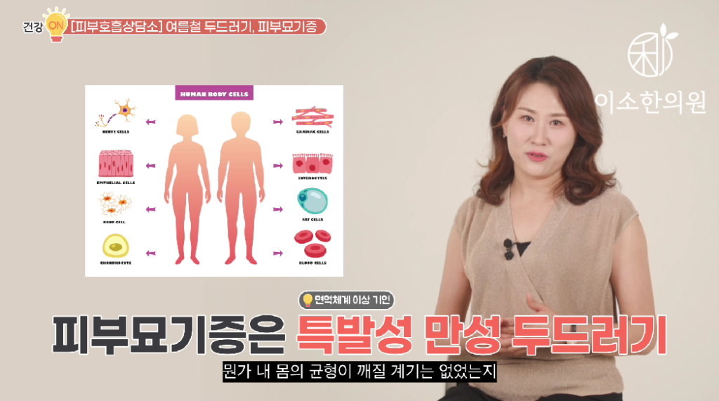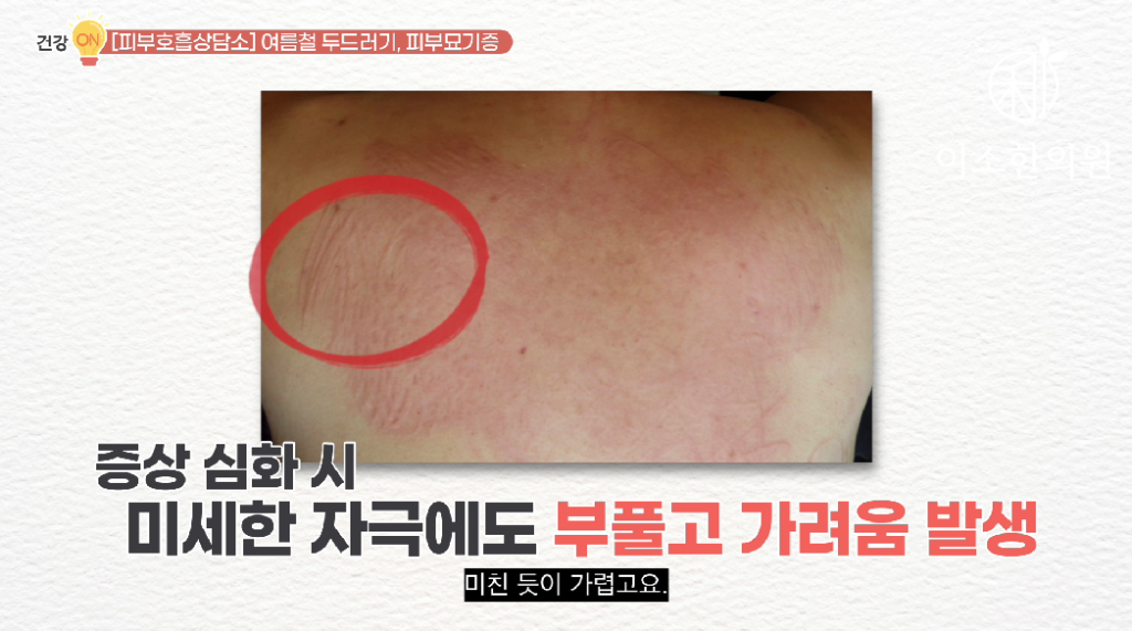 온도와 습도가 높은 여름철은 피부가 좀 끈적끈적하죠. 그래서 옷깃이나 마찰에 좀 더 예민해지고 체온도 높아지기 때문에 피부묘기증 환자들이 좀 더 힘들어 하는 계절입니다.