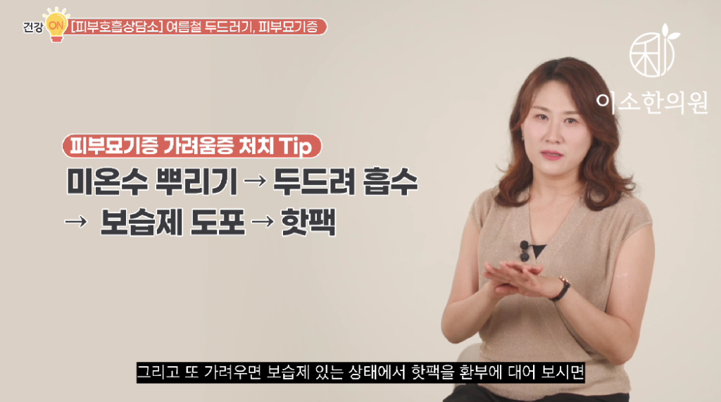 좀 간단하게 한번 정리하자면 냉찜질 보다는 온찜질 하는 것, 그다음에 샤워 할 때는 욕조에서 목욕을 해서 살짝 땀 내주는 것. 그리고 충분한 수분 섭취, 습도 조절, 보습제 사용해서 수분 관리 하는 것인데요.