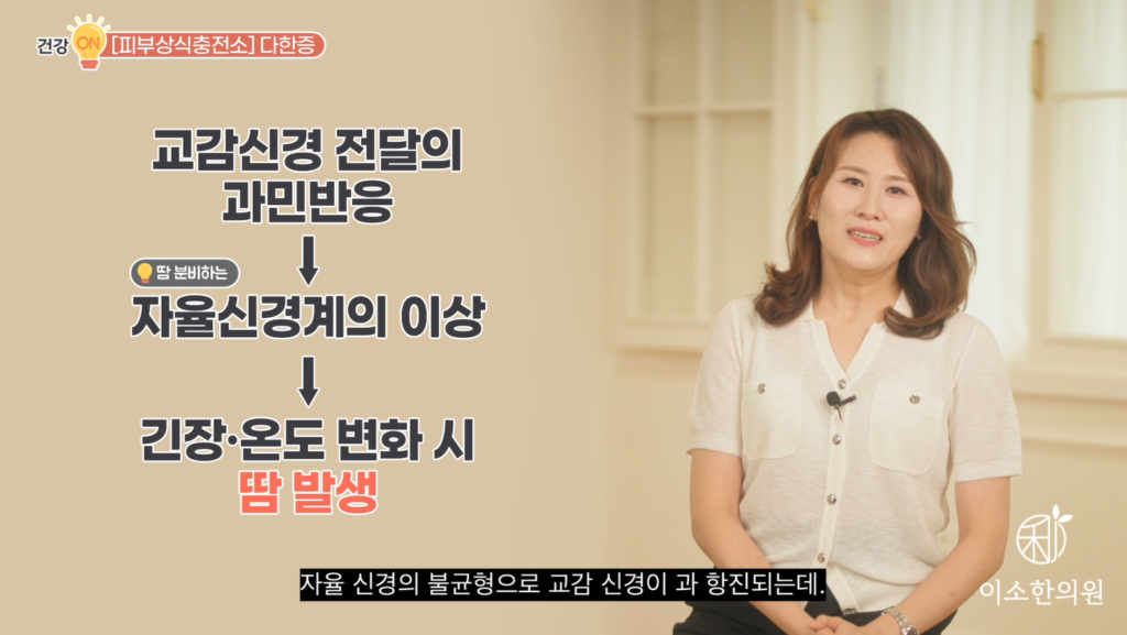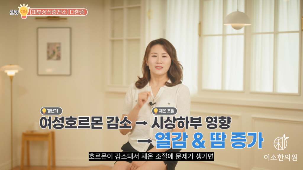 세 번째 전신 다한증은요. 흔한 질환은 갱년기 질환이죠. 여성호르몬이 시상하부에 체온 조절 중추에 작용을 하는데 호르몬이 감소돼서 체온 조절에 문제가 생기면 막 시도 때도 없이 땀이 나고 덥고 할 수 있습니다. 자 낮에도 막 수시로 열이 오르면서 땀이 많아지고요. 또 밤에는 덥고 갑갑하고 막 땀이 나다가 갑자기 막 오한이 들기도 하고 그러면서 밤잠을 설칩니다.