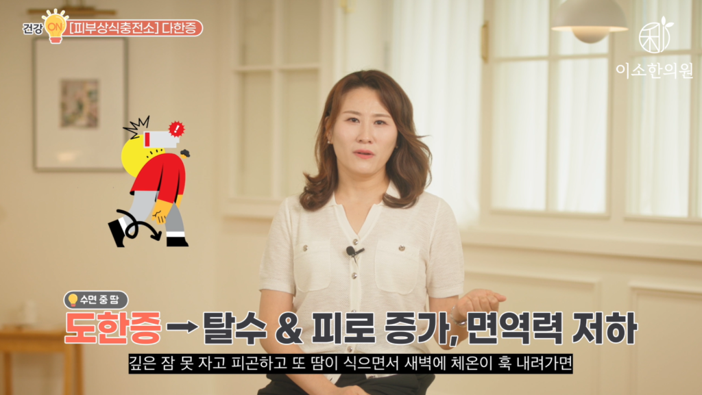 마지막 전신 다한증은요. 수면 중 흘리는 땀 도한증(盜汗症)입니다. 도둑 도(盜), 도둑이 밤새 다녀가듯이 아무도 모르게 밤에 흘리는 땀이다, 해서 도한이라 하는데. 밤에 잘 때 땀을 흘려서 속옷이나 잠옷이 젖고 이 이부자리가 흠뻑 젖는 바로 식은땀입니다. 이렇게 땀을 흘리고 나면 다음날 기진맥진하죠. 잠을 잔 것 같지도 않고 피곤합니다. 땀은 진액(津液), 수분이죠. 근데 잘 때 땀을 흘리고 나면 당연히 탈수 현상도 오고 몸이 지치고 피곤합니다. 깊은 잠 못 자고 피곤하고 또 땀이 식으면서 새벽에 체온이 훅 내려가면 감기가 걸리기도 쉽죠. 면역력도 떨어집니다.