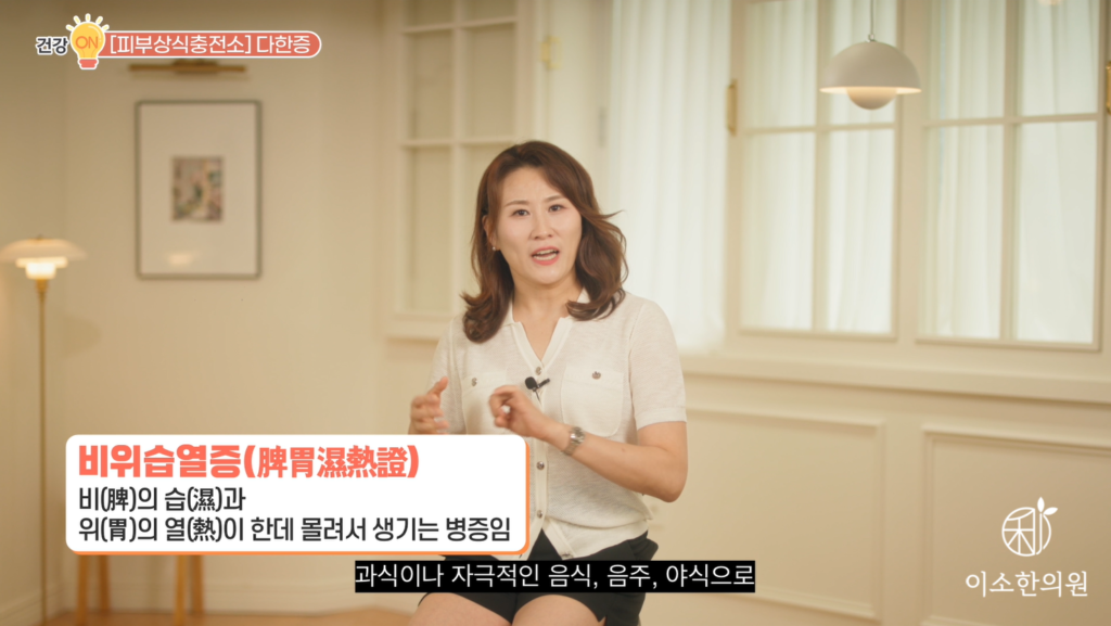 한의학에서는 비위습열증(脾胃濕熱證)이다, 라고 진단을 합니다. 그리고 두면부는요. 소화기에 관련된 경락이 많이 유주하는 흐르는 곳이기 때문에 소화기의 습열 찌꺼기가 좀 이렇게 쌓여 있는 경우 얼굴에서 땀이 많이 흐르고 특히 조금만 뜨겁고 매운 건 먹어도 막 비 오듯이 땀이 날 수 있습니다. 자, 이런 분들 구취증(口臭症)이라 하죠. 입 냄새가 심하거나요. 설사나 무른 변이 잦거나 뭐 밥을 먹어도 항상 배가 헛헛한 느낌이 들거나 혹은 반대로 속이 이렇게 항상 더부룩한 느낌일 수도 있습니다. 두한증, 얼굴에만 음식 먹을 때만 땀이 지나치게 난다면요. 식이 생활에 문제가 없는지 꼭 체크해 보시고 올바른 식이 관리와 치료가 필요합니다.