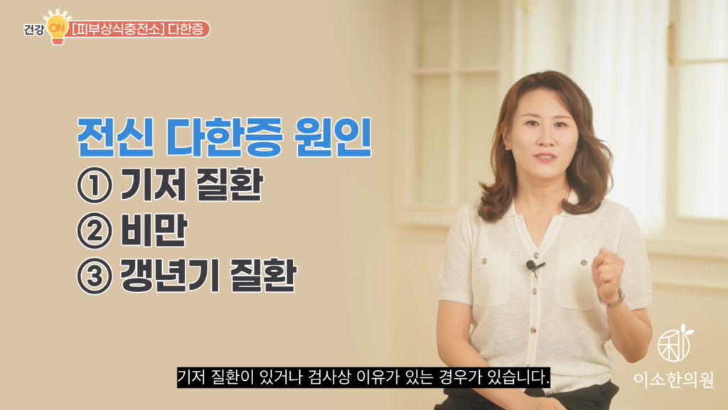 자, 첫 번째로, 비교적 넓은 부위에서 땀이 많이 나는 전신 다한증을 이야기해 보겠습니다. 자, 전신 다한증은요. 기저질환이 있거나 검사 상 이유가 있는 경우가 있습니다. 뭐 당뇨병, 뇌하수체 기능 이상, 갑상선 항진증, 비만 그리고 여성의 갱년기 질환이 있죠.