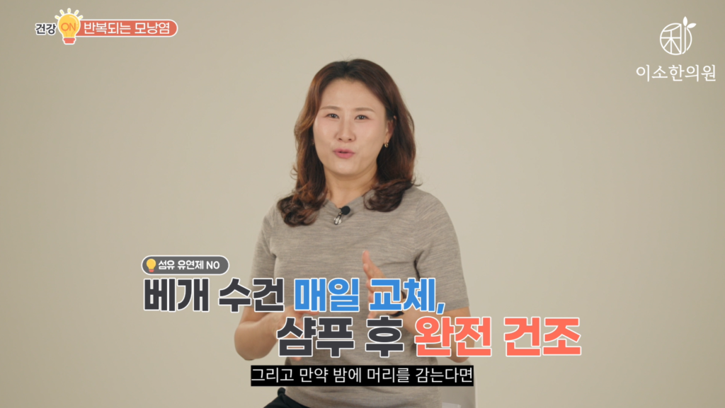 특히 두피 모낭염 환자들은 주무실 때 베개 잘 말린 면수건 꼭 매일 갈아주시고, 섬유 유연제 피해야 되고요. 그리고 만약 밤에 머리를 감는다면 두피까지 바짝 말리는 것 당연히 기본이죠. 어, 엊그제도요. 두피 모낭염 환자분한테 제가 샴푸는 그럼 뭐 쓰세요, 라고 여쭤봤더니. 인터넷을 좋다는 약산성 샴푸요, 이렇게 얘기하시더라고요. 두피는요. 깨끗이 닦아내는 게 중요하다, 여러 번 말씀드렸습니다. 세정력이 좋은 샴푸 사용하시되 물로 깨끗이 헹구시는 게 더 좋겠습니다.