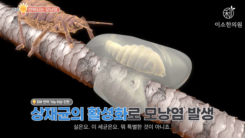 자, 모낭염이 잘 안 낫는 이유 마지막은요. 바로 피부 때문입니다. 피부 환경이 엉망인 거죠, 한마디로. 모낭염을 일으키는 세균도요. 모낭충도요. 뭐 다른 사람에겐 없는 특별한 것이 아니라 했죠. 피부 상재균, 항상 있는 균이라고 합니다. 모든 사람에게는 항상 있는 세균인데 하필이면 모낭염 환자에게만 그 세균이 왕성하게 활동을 하는 거고요. 모낭충도요. 갓 태어난 신생아만 제외하고 99.8%의 사람에게 다 존재하는 기생충입니다. 단, 이 모낭충이 피부의 균형이라든지, 면역기능이 떨어졌을 때 과 증식하게 되는 것이 문제이고 그때 모낭염, 모낭충증이 일어나는 것이죠. 자, 반복되는 모낭염에서 벗어나고 싶다면요. 반드시 피부의 면역 기능 회복이 바탕이 되어야 한다는 거 꼭 기억해야 됩니다.
