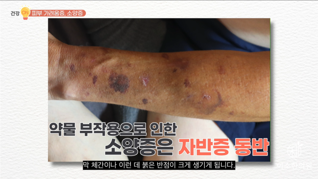 자, 노인 소양증의 대표적인 이유 마지막은요. 약물 부작용입니다. 무심코 사용했던 연고, 다른 치료를 위해 복용했던 약물, 주사 이런 것들로 인해 가려움증이 충분히 생길 수 있습니다. 내가 통증 주사를 좀 자주 맞았는데, 이게 만약에 스테로이드 주사였다거나 혹은 다른 질환으로 의도치 않게 뭐 스테로이드를 장기간 먹었다거나, 약국에서 잘 모르고 사서, 구매해서 사용했던 연고에 혹시 스테로이드가 있다거나, 노인 환자분들 중에는 토피솔이나 데소오웬 같은 그런 로션을 보습제인 줄 알고 막 이렇게 온몸에 바르면서 소양증이 나타나기도 합니다. 이런 케이스 환자분들의 특징은요. 바로 노인성 자반이 같이 나타난다는 것인데. 가려워서 긁으면요. 긁은 자국대로 팔이나 목이나 얼굴이나 막 체간이나 이런 데 붉은 반점이 크게 생기게 됩니다.