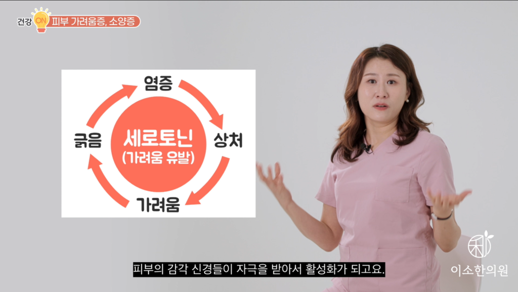 세 번째는요. 필요하다면 신경정신과적인 상담이나 도움도 필요하다, 입니다. 소양증 환자들을 치료하다 보면 외관상 보는 피부 증상이 다 좋아졌는데. 이상하게 가려움을 지속적으로 호소하는 경우가 종종 있습니다. 자, 피부염도 좋아지고 건조함도 좋아졌는데 계속 가렵다, 힘들다, 죽고 싶다. 이렇게 얘기를 하시죠. 만성적인 소양증 환자들 중에는 지속적인 가려움으로 잠도 못 자고 우울해지면서 우울증을 호소하기도 하고 그래서 또 가려움을 느낄 수도 있습니다. 또 우울증과 관련된 세로토닌이라는 호르몬 자체가 가려움 전달에 신경회로를 자극한다고도 하죠. 이런 호르몬 때문에 과도하게 가려움증을 느낄 수도 있고요. 혹은 오랜 소양증으로 마음이 지치고 몸이 예민해지면서 피부 증상이 좋아져도 정신적으로 가렵다고 느끼는 경우도 종종 있기 때문에 만약 가려움증이 지속된다면요. 명상이든 운동이든 이런 것들을 통해 마음이 좀 건강해지는 것이 중요하다. 그리고 만약에 만약에 필요하다면 신경과나 정신과적인 약물의 치료에 도움도 필요할 수 있겠다, 라고 생각해야 합니다.