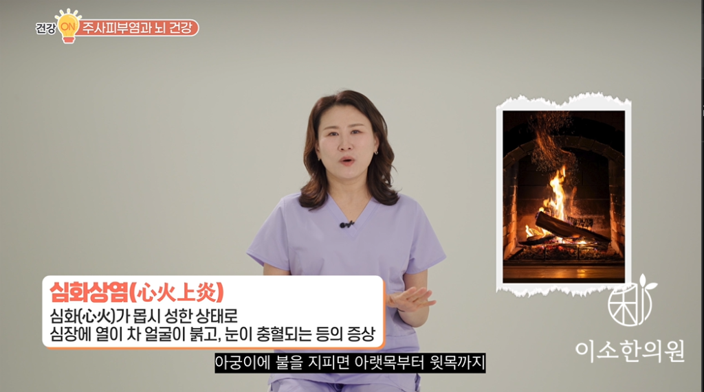 한의학적으로 심화상염(心火上炎)증이라는 용어가 있는데. 심화가 위로 치솟아서 생기는 한의학적인 용어죠. 아궁이에 불을 지피면 아랫목부터 윗목까지 방 전체가 따뜻해져야 하는데. 난방관이 막혔어요. 혹은 미풍이 심하든 여러 가지 원인으로 아랫목만 절절절절 끓고 윗목은 싸늘해지는 상태. 몸 안에 체온 조절이 제대로 안 되는 상태를 바로 심화상염증이라고 합니다. 이렇게 난방 시스템이 고장 난 이유가 여러 가지가 있을 수 있듯이 몸에 열 대사 장애가 발생한 이유도 여러 가지가 있을 겁니다. 한의학적인 관점으로 체온의 불균형을 바로잡는 과정이 꼭 필요한 주사피부염이 바로 신경성 주사피부염입니다.