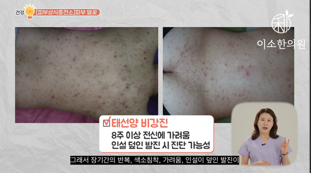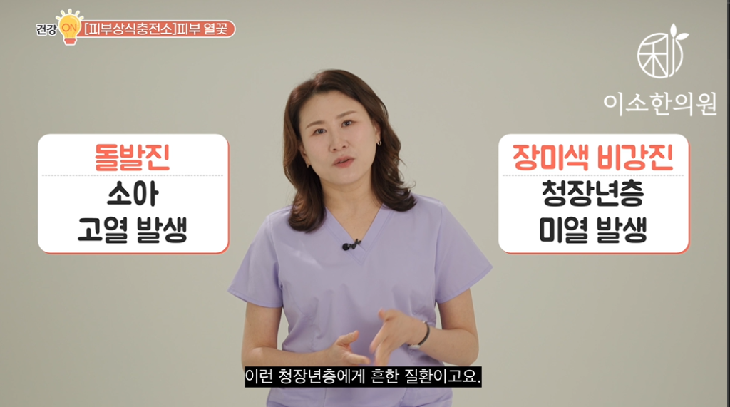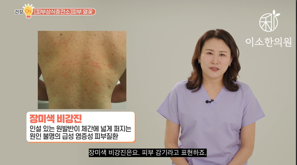 “성인에게 흔한 장미색 비강진, 물방울양 건선, 만성 태선양 비강진은 몸살감기 같은 선행 증상이 있을 수 있는 만큼 평상시에 면역력 관리가 중요한 피부 질환입니다.”