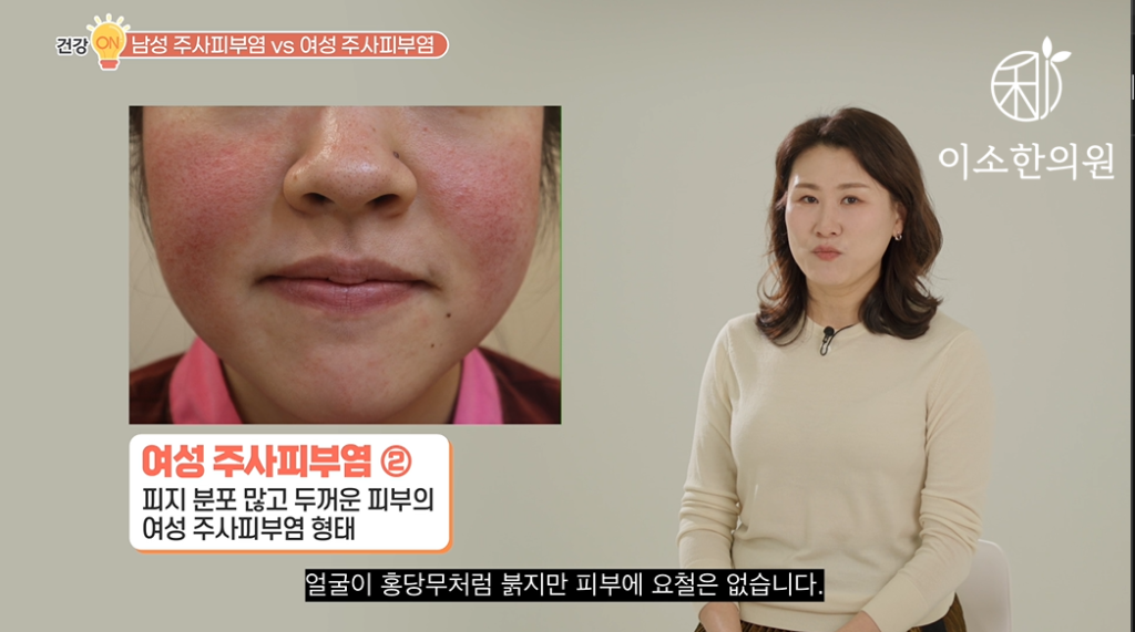 자, 그렇다면요. 이번에는 여성형 주사피부염 타입에 대해서 이야기해 보겠습니다. 남성에 비해 여성은요. 좀 더 다양하고 복잡합니다. 자, 여성 피부는 남성에 비해 얇고 피지 분포가 적기 때문에 주사로 피부에 열이 나면 수분 손실이 심해져서 화끈거리고 달아오르는 느낌과 복잡한 불편감이 나타날 수도 있습니다.