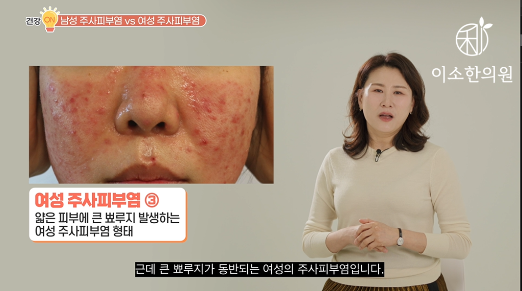 두 번째 타입과 세 번째 타입의 주사피부염도요. 현대 의학적인 치료로 좀 접근하기 참 어려운 스타일이죠. 항생제 먹어도 크게 호전도 안 되고 뭐 자칫 레이저 시술을 하자니 피부 자극이 돼서 염증이 악화될 수도 있을 겁니다. 이런 분들은요. 그리고 보통은 뒷목이 당긴다, 잠을 못 이룬다, 피부가 따갑고 가렵다 등등의 자각 증상이 동반되고요. 손발을 차고 가슴 위로만 열이 훅 오른다, 라고 표현하기 쉽습니다. 상체로만 혈류량이 모여서 나타나는 피부 증상과 열 대사 장애로 인한 전신 증상을 바로잡아야 하는 그래서 피부 염증을 해결해야 하는 한의학적인 치료가 필요한 주사피부염에 해당합니다.