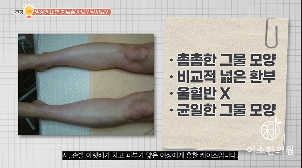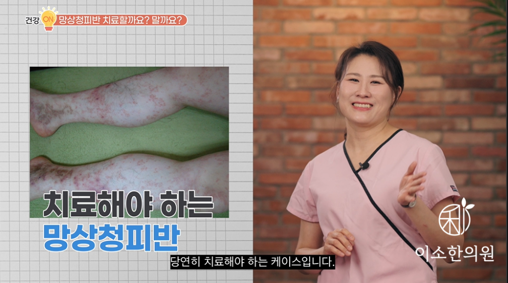 치료 없이 방치하는 이유 중에 하나는요. 아마도 병원에 이곳저곳 가 봐도, 또 검사도 해봐도 특별한 이상이 없다. 치료법도 없다, 하기 때문일 텐데. 현대의학적인 치료법이 없다는 것이지, 방치한다고 자연 치유된다는 뜻은 아닙니다. 감히 이야기하건데 망상청피반, 울혈반모양 혈관염은 현대의학적인 치료법이 없습니다. 울혈반이 보이는 망상청피반이 나타난다면 간혹 루푸스와 같은 다른 자가 면역 질환으로 2차적으로 발생할 수도 있기 때문에 한 번쯤은 혈액 검사해보는 것도 괜찮지만, 굳이 검사에 목멜 필요는 없다는 거죠. 음 10명 중에 9명 이상은요. 현대 의학적으로 어떤 검사 상 원인이나 치료법을 찾을 수 없기 때문에 하루라도 빨리 내원하셔서 치료가 필요한 케이스입니다.