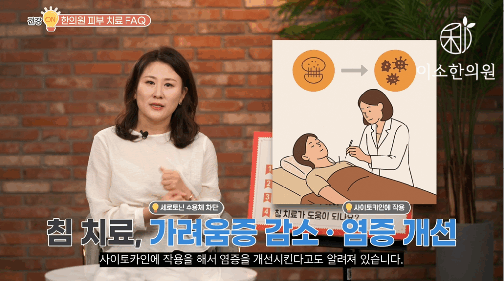자, 네 번째 많이 하시는 질문은요. 침 치료가 피부질환에 도움이 되나요, 입니다. 침 치료가 호전에 도움이 된다는 내용은 여러 논문을 통해서도 검증이 되고 있죠. 침 치료는요. 세로토닌 수용체를 차단해서 가려움을 좀 감소시키거나 혹은 인터루킨-2나 인터루킨-4, 인터페론 감마 같은 사이토카인에 작용을 해서 염증을 개선시킨다고도 알려져 있습니다. 또 침 자극 자체가 혈류 순환을 촉진시켜서 피부 재생이나 회복에도 도움이 됩니다. 가려움을 진정시키거나 재생을 돕기 위해서는 침 치료가 필요하겠죠. 근데요. 치료의 목표는 염증이 안 일어나도록 해주는 것이 가장 중요하겠죠. 염증반응이 소실되면서 가려움이 없어지게 되는 것이고요. 그다음 과정이 피부가 잘 재생되고 회복되는 것이기 때문에 무엇보다 면역체계의 안정으로 염증을 해결하는 것이 조금 더 우선이고요. 이는 내복약, 한약 복약이 담당하는 역할입니다.