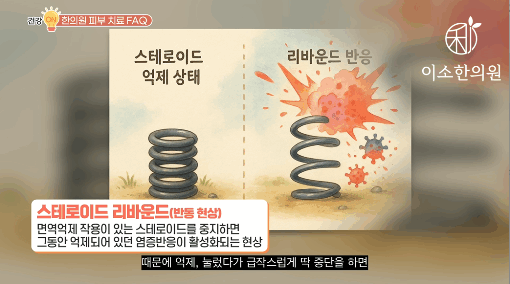 자, 스테로이드나 면역억제제, 생물학적 제제는 면역 반응의 어느 과정, 어떤 매개 물질을 차단하느냐의 차이지. 기본적으로 면역 반응을 억제하는 작용을 합니다. 때문에 억제, 눌렀다가 급작스럽게 딱 중단을 하면 용수철이 반동 튀듯이 이런 리바운드, 반동 현상이 일어날 것입니다. 자 피부 질환의 근본적인 치료 목표는 면역 체계를 정상화시키는 것이지만 그 과정에는요. 시스템과 시간이 필요합니다. 자, 면역 체계를 올바르게 행동하도록 교육을 시키는 동안 급작스럽게 막 널뛰지 않도록 기존 약물을 조절하면서 병행해야만 환자분이 좀 덜 힘들 것입니다. 대신 이때 중요한 것이 꼭 저와 잘 상의하면서 조금은 힘들더라도 고비고비를 넘기는 것이죠. 면역체계를 잘 교육해서 정상화시키면서 이런 약물들을 조금씩 줄여나갈 수 있습니다. 자, 환자의 상태를 좀 꼼꼼히 점검하면서, 반동을 최소화하도록 하면서, 체계적으로 조절을 해드립니다. 그러면 최종적인 목표인 면역억제제, 스테로이드 줄이고 끊고 한의학적인 치료 없이도 완전 관해가 유지되는 상태가 될 수 있습니다.