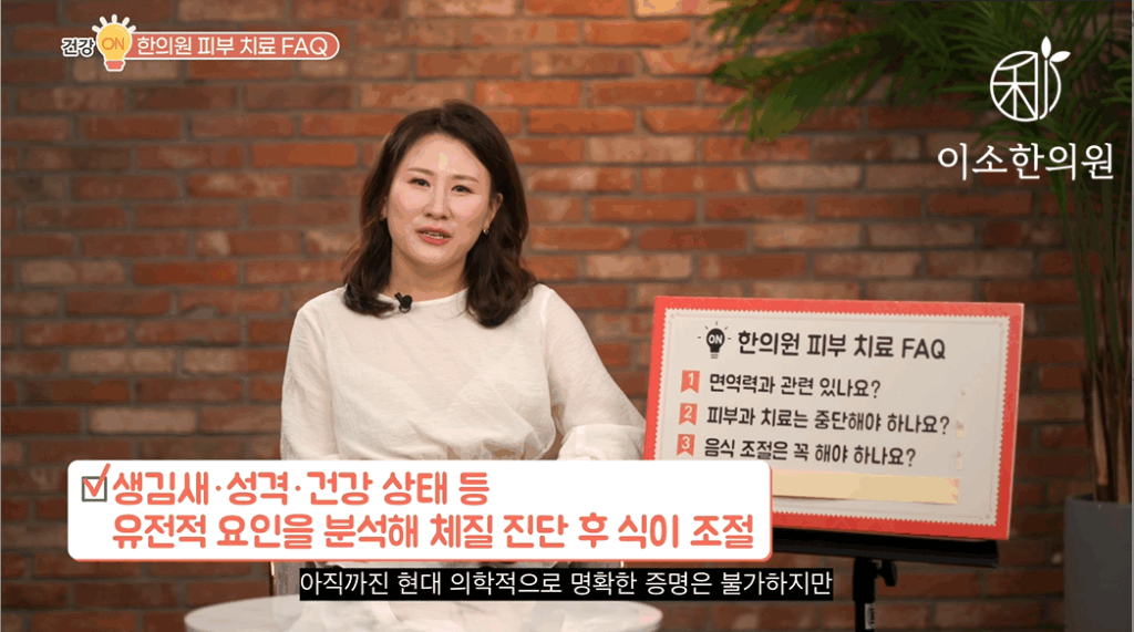 정리하자면 만성적인 피부질환이라면 우선은 염증을 해결하고 가려움을 완화시키고 재생을 도모하는 것이 치료 과정이기 때문에 한약 치료가 우선적으로 고려돼야 되고요. 그다음에는 좀 더 빠른 회복을 위해서 침 치료를 병행하는 것이 필요하다, 라고 정리하겠습니다.