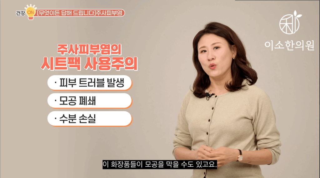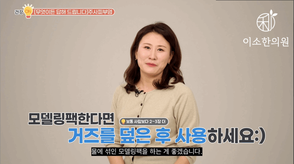 만약에 주사 환자가 모델링팩을 한다면요. 쿨링 의미, 쿨링 정도의 의미로만 접근하면 좋겠습니다. 시트팩과 마찬가지로 앰플이나 화장품을 바르고 팩을 하면 어떤 성분이 민감해진 피부에 알레르기 반응을 유발할지도 모르기 때문에 얼굴이 뜨끈뜨끈 열이 날 때 시원한 물을 섞은 모델링팩을 얼굴에 덮어서 조금 시원하게 해 준다, 라는 정도로 접근해야 합니다. 또 모델링팩의 장점이요. 오히려 주사 환자에겐 단점이 될 수도 있는데, 입자가 고운 가루가 피부에 밀착돼서 유효 성분 침투를 높인다 했죠. 이 말은 모델링팩 가루가 모공 사이에 껴서 주사 환자에게는 염증을 유발할 수도 있다는 거죠. 때문에 모델링팩을 제거한 후에는 해면 같은 걸로 얼굴 이렇게 좀 꼼꼼히 닦아서 팩이 남아있지 않아야 하는데. 그러면 또 피부에 자극이 되기 때문에 만약 모델링팩을 굳이 하고 싶다면요. 팩 제거 후에 얼굴에 남아 있지 않도록 가루가 이런 거즈를 보통 사람보다 두세 장은 더 많이 깔고 물에 섞인 모델링팩을 하는 게 좋겠습니다. 자, 며칠 전에도 원래는 홍조 위주의 주사였는데 이 모델링팩을 집에서 셀프로 하신 후에 염증성 주사가 됐다고 내원하신 분이 있었습니다. 굳이 돈 들이고 리스크 있는 팩은 권하지 않습니다.