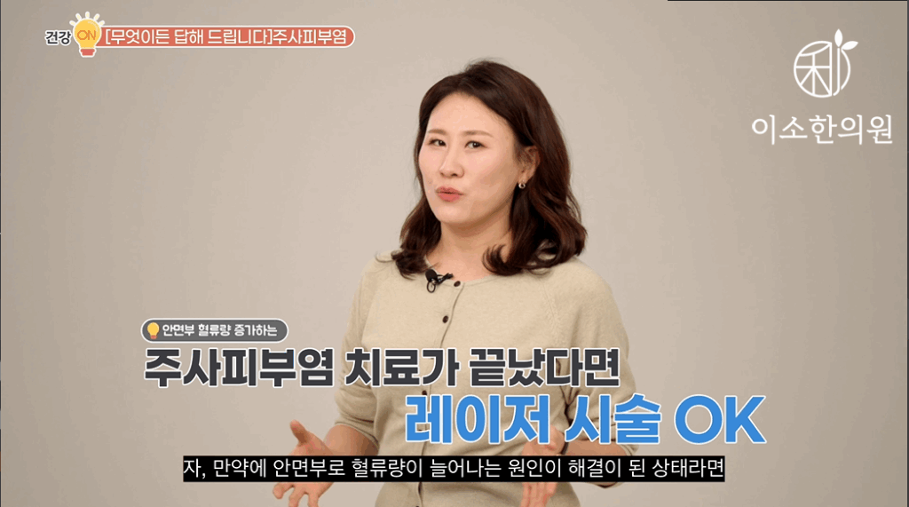 자, 만약에 안면부로 혈류량이 늘어나는 원인이 해결이 된 상태라면 레이저 시술 좋습니다. 이미 손상된 혈관만 딱 파괴해주면 주사피부염 끝이겠죠. 근데 레이저 시술은 충혈, 혈관 확장이 되고 피부에 염증이 반복되는 이유를 해결하는 것은 아니기 때문에 뭐 레이저 시술받을 때만 좋았다, 이런 말들을 하게 되는 거죠.