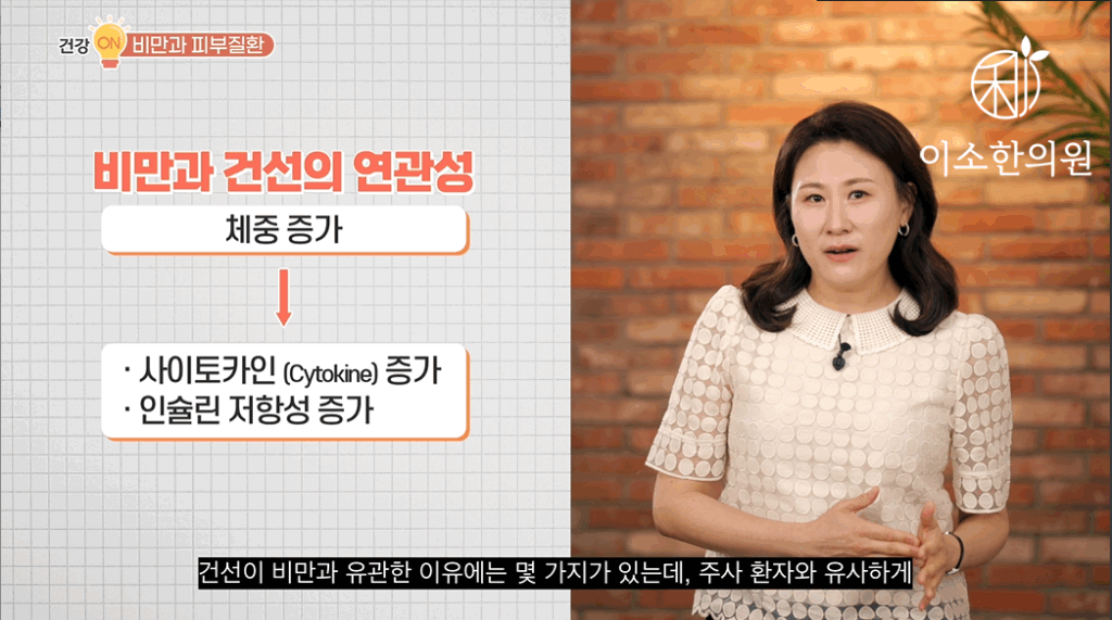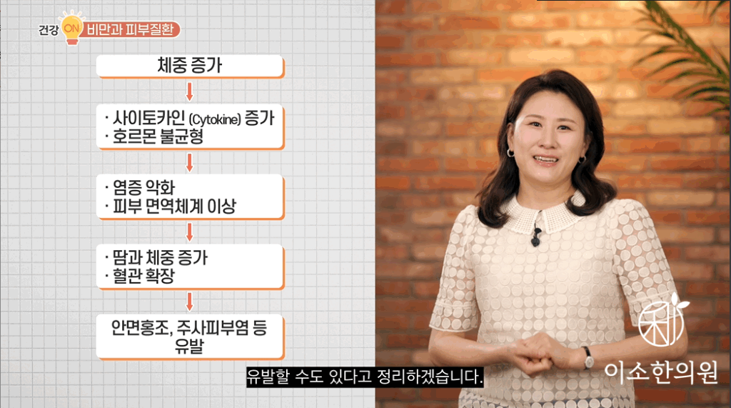 “어느 날 갑자기 어떤 피부질환이 생겼다면 그 원인이 살이 찐 것이 아닌지는 꼭 체크하고요. 그리고 피부질환의 예방과 빠른 치료를 위해서는요. 다이어트 꼭 필요하겠습니다.”