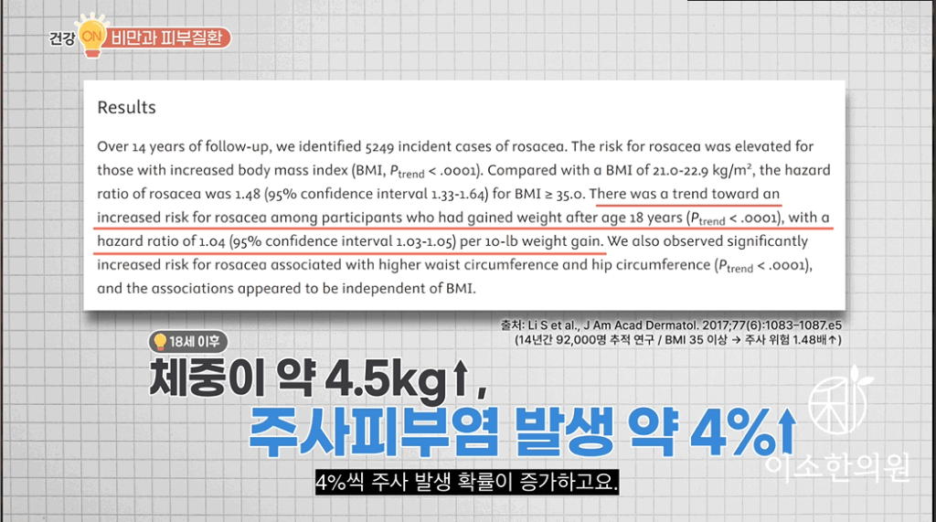 자, 첫 번째는요. 빨간 얼굴, 주사피부염과 비만 연관이 있는지 알아보겠습니다. 미국에서 약 9만 명의 여성을 대상으로 역학적인 분석을 한 결과가 BMI가 35이상인 비만 여성은요. 정상 체중의 여성보다 주사 발생 위험이 1.5배 높다고 조사되었습니다. 특히 18세 이후 체중이 10파운드, 약 4.5kg 늘어날 때마다 4%씩 주사 발생 확률이 증가하고요. 허리둘레와 엉덩이둘레가 클수록 위험이 높아진다, 라고 이야기했습니다. 즉, 체중 증가, 복부지방, 내장지방의 증가가 빨간 얼굴, 안면홍조를 유발 시킬 수도 있고, 악화시킬 수도 있다. 그런 요인이 될 수 있다고 이해하겠습니다.