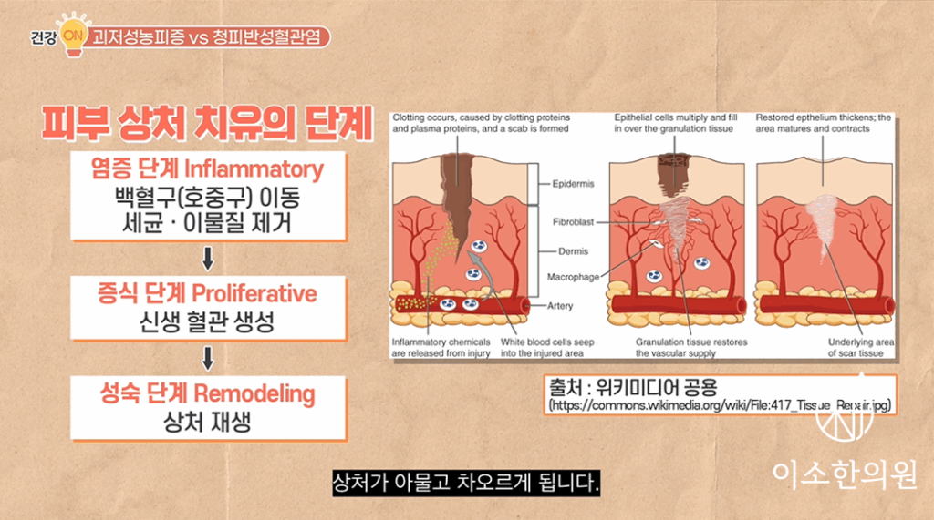 자, 피부에 상처가 생기면요. 호중구를 비롯한 백혈구가 이동을 합니다. 그리고 염증이 발생하면서 세균이나 이물질 등을 제거하고, 신생 혈관이 만들어져서 산소 영양분 공급하면 상처가 아물고 차오르게 됩니다.