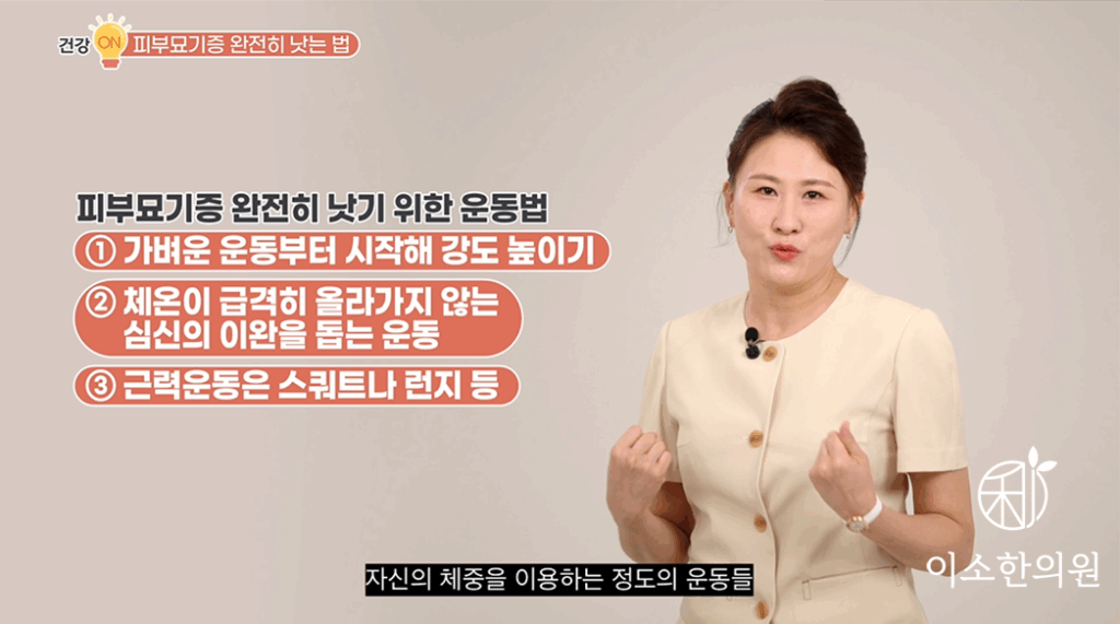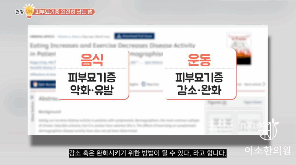 자, 두 번째 피부묘기증에서 벗어나기 위해 중요한 것은 바로 운동입니다. 23년에 소개된 또 다른 논문에 따르면요. 음식 섭취가 피부묘기증을 악화 혹은 유발시킬 수 있는 요인이 되고 반면에 운동은 이렇게 악화된 피부묘기증을 감소 혹은 완화시키기 위한 방법이 될 수 있다, 라고 합니다. 그리고 음식 섭취 전보다는 섭취 후에 운동을 하는 것이 묘기증 완화에 더 도움이 된다, 라고 이야기하고 있습니다. 자, 정리하겠습니다. 피부묘기증에서 벗어나고 싶다면요. 음식이나 식이 관리가 중요하다. 그리고 적절한 운동, 특히 식사 후에 운동을 규칙적으로 해 주는 것이 필요하다, 라고 이야기할 수 있습니다.