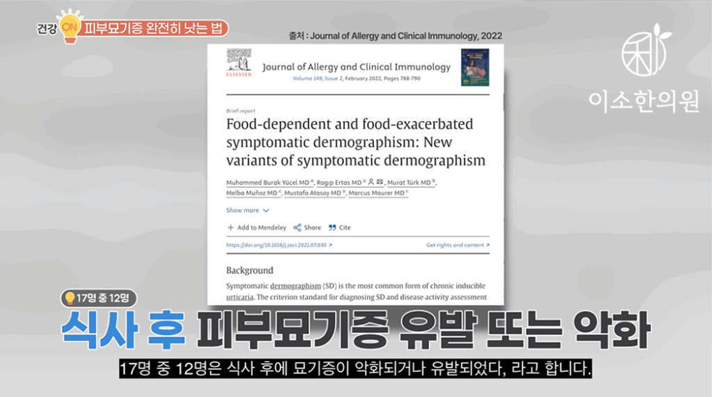 첫 번째는 음식 관리입니다. 22년 국제알레르기학회 논문에 따르면 피부묘기증 환자에게 적어도 4시간의 공복 시간을 가진 경우와 그리고 식사 후에 묘기증 반응을 유발했을 때 17명 중 12명은 식사 후에 묘기증이 악화되거나 유발되었다, 라고 합니다. 자, 그리고 이 중에 7명은요. 식사 후에 묘기증 유발 시간과 팽진의 정도가 심해지는, 음식 악화성 피부묘기증(food-exacerbated sympomatic dermographism)에 해당이 되고. 5명은 음식을 섭취한 후에만 반응이 유발되는 음식 의존성 피부묘기증(food dependent dermographism)이다, 라고 언급하고 있습니다.