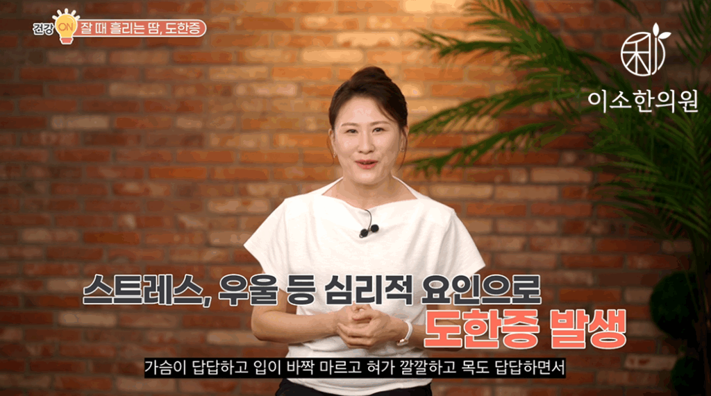 마지막으로는요. 간화(肝火)라고 진단하는 경우입니다. 뭐 간에 열이 많다, 라고 이야기하는데. 스트레스나 우울감이나 화병이나 감정 기복이나 혹은 불면 등등이 있는 사람이 가슴이 답답하고 입이 바짝 마르고 혀가 깔깔하고 목도 답답하면서 도한증이 생길 수 있습니다. 자, 수면 중에 땀이 많이 난다면요. 이들 중에서 어디에 해당하는지 잘 살펴보시고요. 병증에 맞는 한의학적인 치료가 필요합니다.