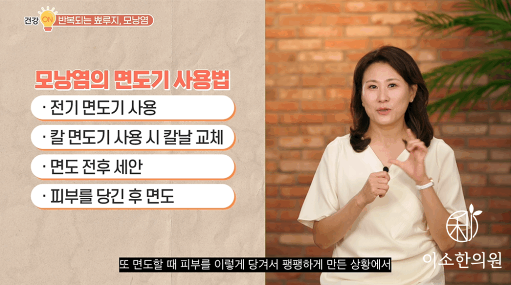 자, 그렇다면요. 반복되는 뾰루지 해결을 위해 꼭 해야 할 것 가르쳐 드리겠습니다. 모낭염이 있는 남성이라면요. 칼 면도기 사용은 피하는 것이 좋습니다. 특히 여러 번 사용해서 칼날이 무뎌진 면도기는 모낭 입구 상처를 유발해서 염증을 악화시킬 수 있습니다. 면도기는요. 가급적 전기면도기 사용하고 만약에 칼 면도기를 사용해야 한다면 칼날을 매일 갈아주는 것, 그다음에 면도할 때는 전후에 깨끗이 세안을 해서 피부 상재균의 감염을 최소화해줘야 하고요. 또 면도할 때 피부를 이렇게 당겨서 팽팽하게 만든 상황에서 면도를 하면 상처를 최소화할 수 있습니다.