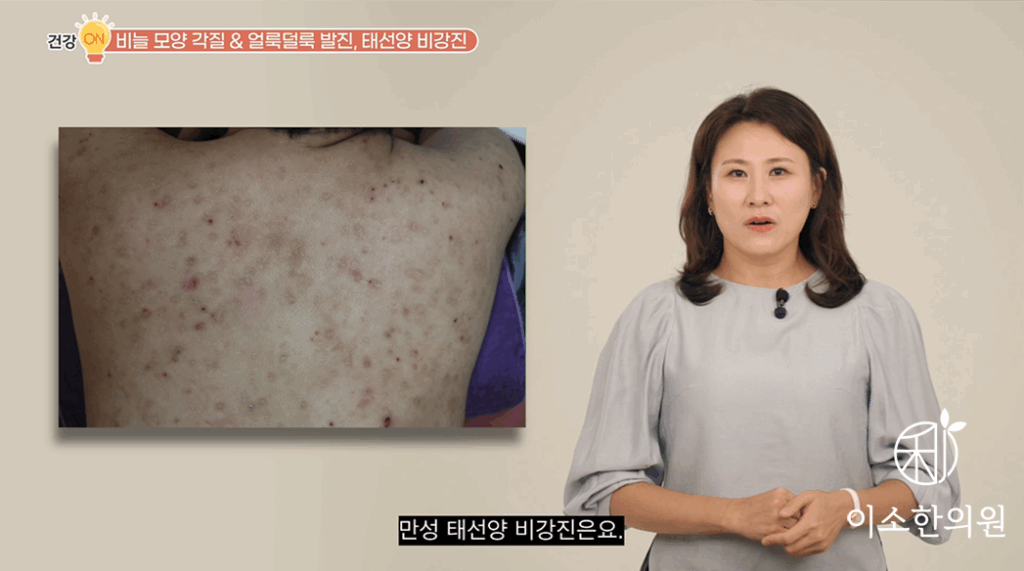 환절기, 몸살감기 후에 피부 발진, 수포, 붉어짐, 가려움, 비늘 모양의 인설, 각질 등이 일어난다면 혹은 어느 날부터 한두 개씩 생겨난 적갈색 발진이 쌓이고 쌓이면서 몸이 얼룩덜룩 지저분해져서 고민이라면요. 태선양 비강진은 아닌지 꼭 체크해야 됩니다. 자칫 잘못하면요. 이 얼룩덜룩한 피부가 10년, 20년 지속될 수 있다는 거 꼭 기억해야 합니다.