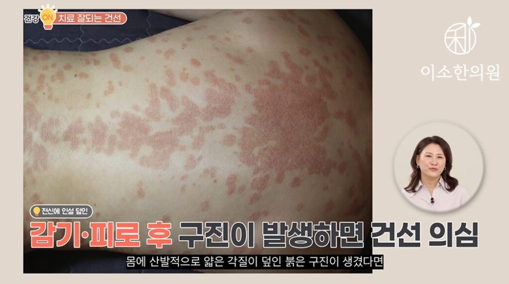 물방울 건선의 특징은요. 발병 전후에요. 감기 같은 인후염이 발생할 수도 있습니다. 연쇄상구균의 감염으로 인후염이 생긴 후에 염증에서 해결되는 과정에 자가 면역반응이 일어나고, T세포가 과활성 하면서 진피에 염증, 피부에 각화세포 증식으로 물방울 건선이 생기는 거죠. 만약에 감기를 앓고 난 후에, 혹은 피로한 후에 몸에 산발적으로 얇은 각질이 덮인 붉은 구진이 생겼다면 건조한가, 열꽃인가, 라고 할 것이 아니라 바로 건선을 의심해야합니다.