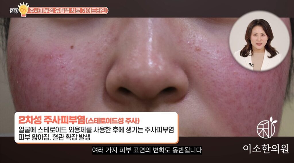 그리고 또 한 가지 스테로이드를 테이퍼링을 통해 끊으라고는 하지만 2차성 주사피부염까지 이르렀을 때는요. 실은요. 자연 회복, 개선되기는 실제로 쉽지 않습니다. 피부 면역체계 교란이라고 하죠. 그로 인한 염증 반응, 피부 장벽이 손상이 아주 복합적으로 있기 때문에 무조건 기다리는 것은 능사가 아니고요. 피부 재생 주기 두 번, 8주 정도 한번 살펴보신 후에 증상이 그래도 악화가 되고 호전이 없다면 하루빨리 한의학적인 치료가 필요합니다.