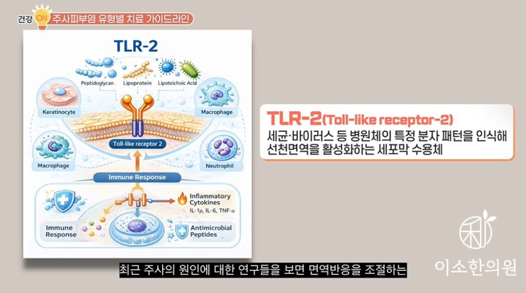 주사피부염의 타입에 따라 하지 말아야 할 것, 그리고 해야 할 것 이야기해봤는데요. 주사피부염 완치 해결을 위해 가장 중요한 것은 근본적인 원인 해결, 전체적인 발생 과정의 조절입니다. 최근 주사의 원인에 대한 연구들을 보면 면역반응을 조절하는 TLR-2의 과민반응으로 염증이 반복되면서 혈관 확장이 주사의 발생 원인이라고도 합니다. 즉 주사를 완전히 치료하려면 가장 기본은 면역기능의 정상화를 통한 염증 해결입니다.