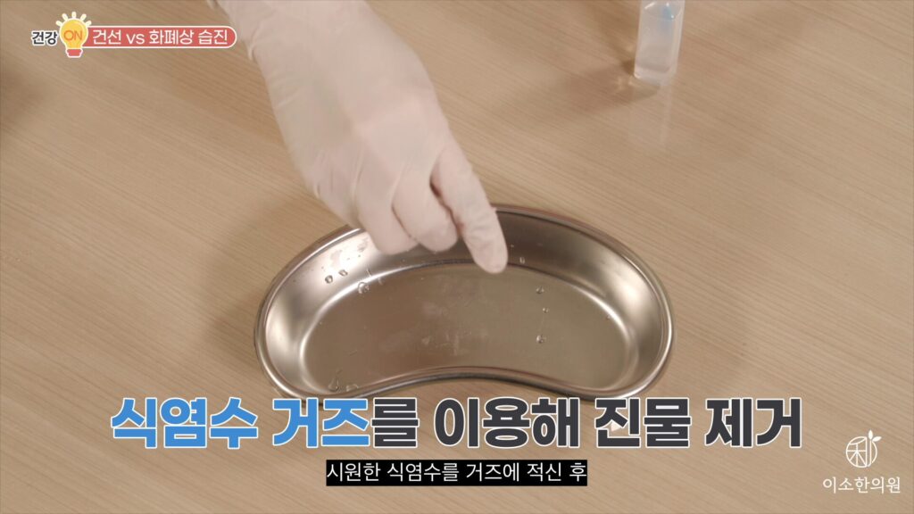 건선은 치료가 필요한 질환이지 처치에 있어서 크게 주의점은 없습니다. 충분한 보습, 그리고 긁거나 마찰 피하고 인설을 떼어내지 않으면 됩니다. 화폐상 습진은요. 올바른 보습 방법이 중요합니다. 처음에 구진, 수포가 형성되면서 진물이 조금 맺히거나 진물이 딱지로 앉기 전에는 보습제가 진물하고 섞이면서 딱지 형성이 늦어지고, 진물이 더 심하게 흐를 수 있기 때문에 피해야 합니다. 화폐상 습진. 진물이 있을 때, 가려울 때는 보습제보다는 빨리 진물이 마르도록, 진물이 많아져서 가피가 두껍게 앉지 않도록 하는 것이 중요하죠. 미용 티슈를 덮어서 진물 말리기도 하는데 티슈를 사용한다면 꼭 무형광 천연 펄프 100% 티슈 선택해야 됩니다. 화학제품이 함유된 티슈가 화폐상 습진 상처의 알레르기 반응 유발할 수도 있습니다. 그래서 저는요. 안전한 식염수 거즈를 권해드립니다. 멸균 식염수, 멸균 거즈 준비해서 시원한 식염수를 거즈에 적신 후 대신 아주 꾹 짜서 물이 전혀 흐르지 않는 상태에서 진물 부위에 덮었다가 몇 번 갈아주면서 진물 마른 후에 제거하면 됩니다. 시원한 거즈가 쿨링 효과도 있고요. 젖은 거즈는 진물 진물과 엉켜 붙는 것을 막아줍니다. 만약 환부에 거즈가 붙었다면 식염수나 깨끗한 물로 적시면서 거즈 제거하면 됩니다. 진물이 굳어서 딱지나 가피가 생겼다면요. 가피에 균열, 크랙이 생기지 않도록 손바닥에 보습제를 비빈 후에 누르듯이 살짝 발라서 피부가 완전히 재생될 때까지 딱지가 탈락하지 않도록 해야 됩니다. 딱지, 가피가 다 떨어지면요. 색소침착이 빨리 회복되도록 그때는 보습제를 충분히 사용하면 됩니다.
