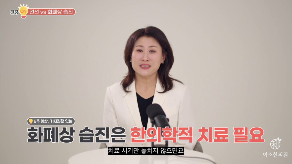 화폐상 습진은요. 발병 기전이 피부 장벽 약화, 알레르기 유발 물질, 자극 접촉에 대한 과민반응으로 인한 염증입니다. 때문에 화폐상 습진은 우선 진물이 나고 가렵다면 항히스타민제, 스테로이드 단기간 사용하고. 진물 관리 잘하고 딱지 떨어진 후에는 보습해서 피부 장벽 튼튼히 만들고 자극이 다시 염증 유도하지 않도록 하면 됩니다. 문제는 그런데 반복되는 만성적인 화폐상 습진인데. 보통 아토피나 양진과 같은 피부 면역체계 이상이 기반이 있을 경우에 종종 발생합니다. 피부 장벽이 이미 약해진 상태이기 때문에 스테로이드 연고로 진물이나 딱지 해결돼도 자극이 또 염증을 유발하죠. 그리고 오히려 연고 사용의 반복이 피부 장벽 약화 시키면서 미세한 자극에도 염증이 증폭될 수도 있습니다. 만약 6주 이상 반복하거나 기저질환이 있는 화폐상 습진 환자라면 피부 장벽 개선을 위한 한의학적인 치료 병행이 꼭 필요합니다. 치료 시기만 놓치지 않으면요. 만성 화폐상 습진으로 발전하지 않게 치료 잘 할 수 있습니다.