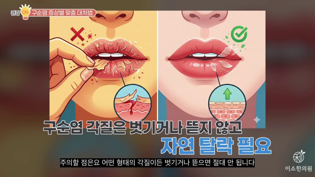 주의할 점은요. 어떤 형태의 각질이든 벗기거나 뜯으면 절대 안 됩니다. 양치질하고 물이 묻어 있을 때 수건으로 밀어서도 안 되고요. 손으로 뜯어도 절대 안 됩니다. 피부가 다 재생이 돼서 각질층이 자연스럽게 치환될 때까지 꼭 기다려야 됩니다.
