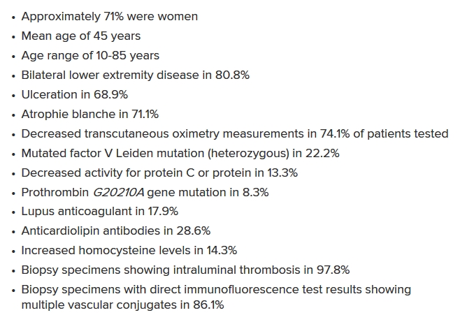 그리고 74.1%환자가 경피의 산소농도가 저하되어 있고 22.2%환자에게서 혈액응고에 관여하는 factor V의 돌연변이가 나타납니다. 13.3%환자에게 혈액응고조절인자인 protein C의 감소가 있으며 8.3% 환자에게 prothrombin G20210A 유전자의 돌연변이가 있다고 합니다.