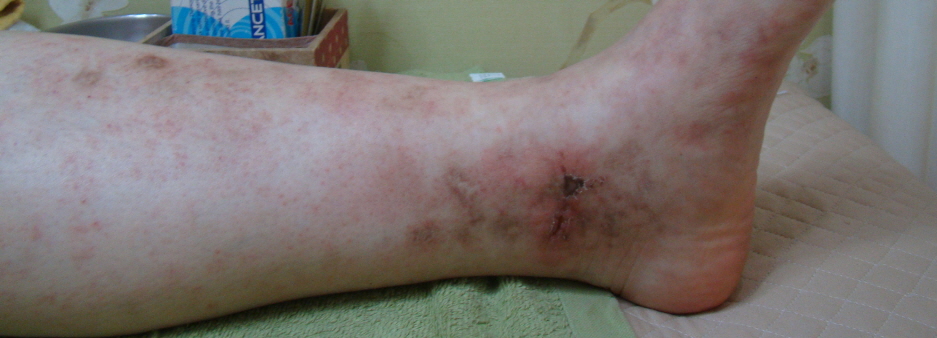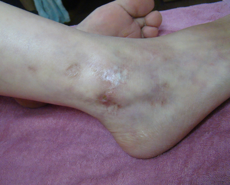<청피반성혈관장애는 주로 복숭아뼈 부근으로 궤양이 발생합니다.>